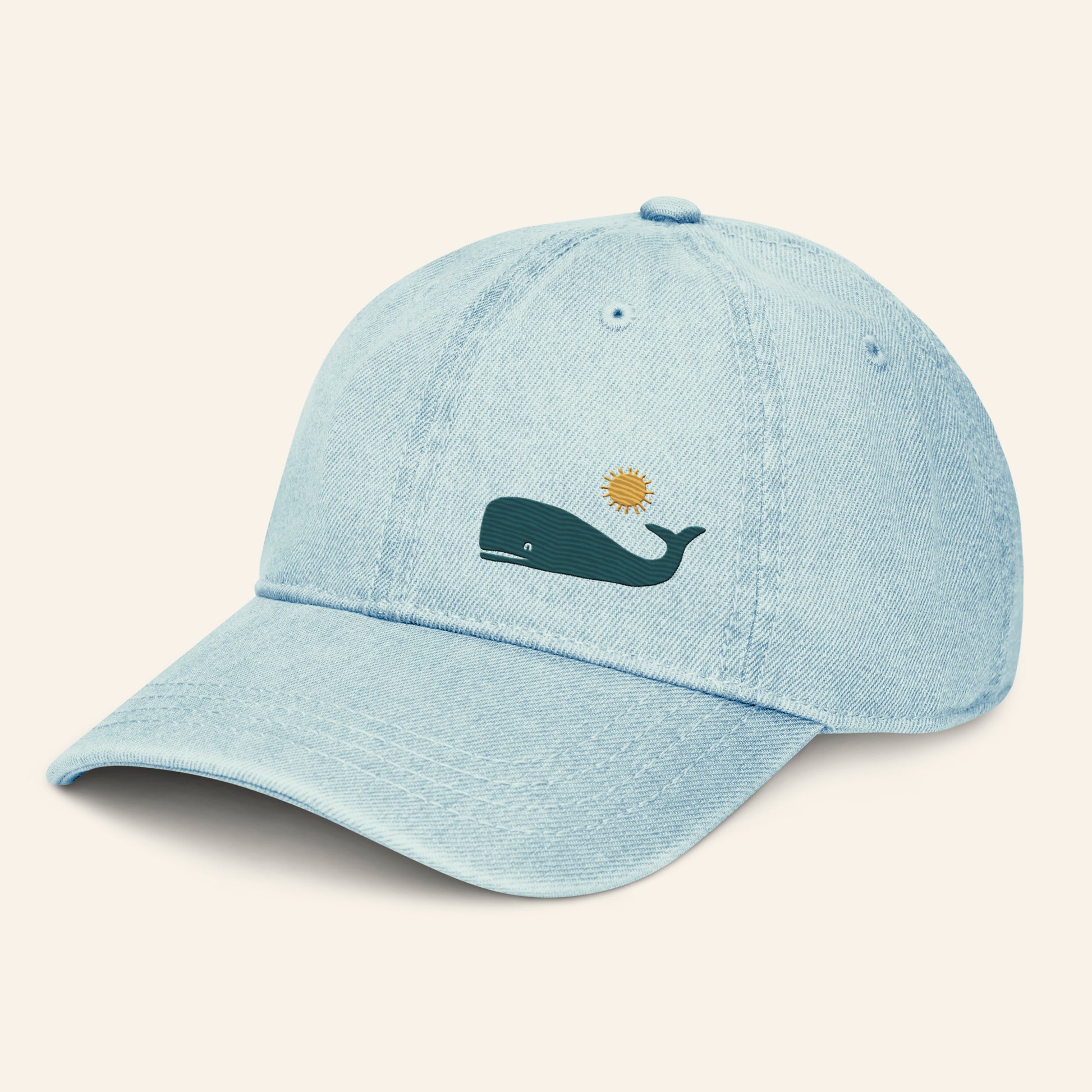 Denim Cap made from sustainable, eco-friendly materials. Spread your love for animals and plants with this pigment-dyed, light blue denim cap with a sperm whale embroidered on the front. Made from 100% cotton, it features a soft crown, low profile design, six stitched eyelets, and an adjustable strap (fits 55 – 64 cm head circumference). Enjoy Free Worldwide Shipping and effortless style. Ideal for nature lovers, beach days, sustainable fashion, and fun streetwear. Perfect for everyday use, designed for comfort and style.